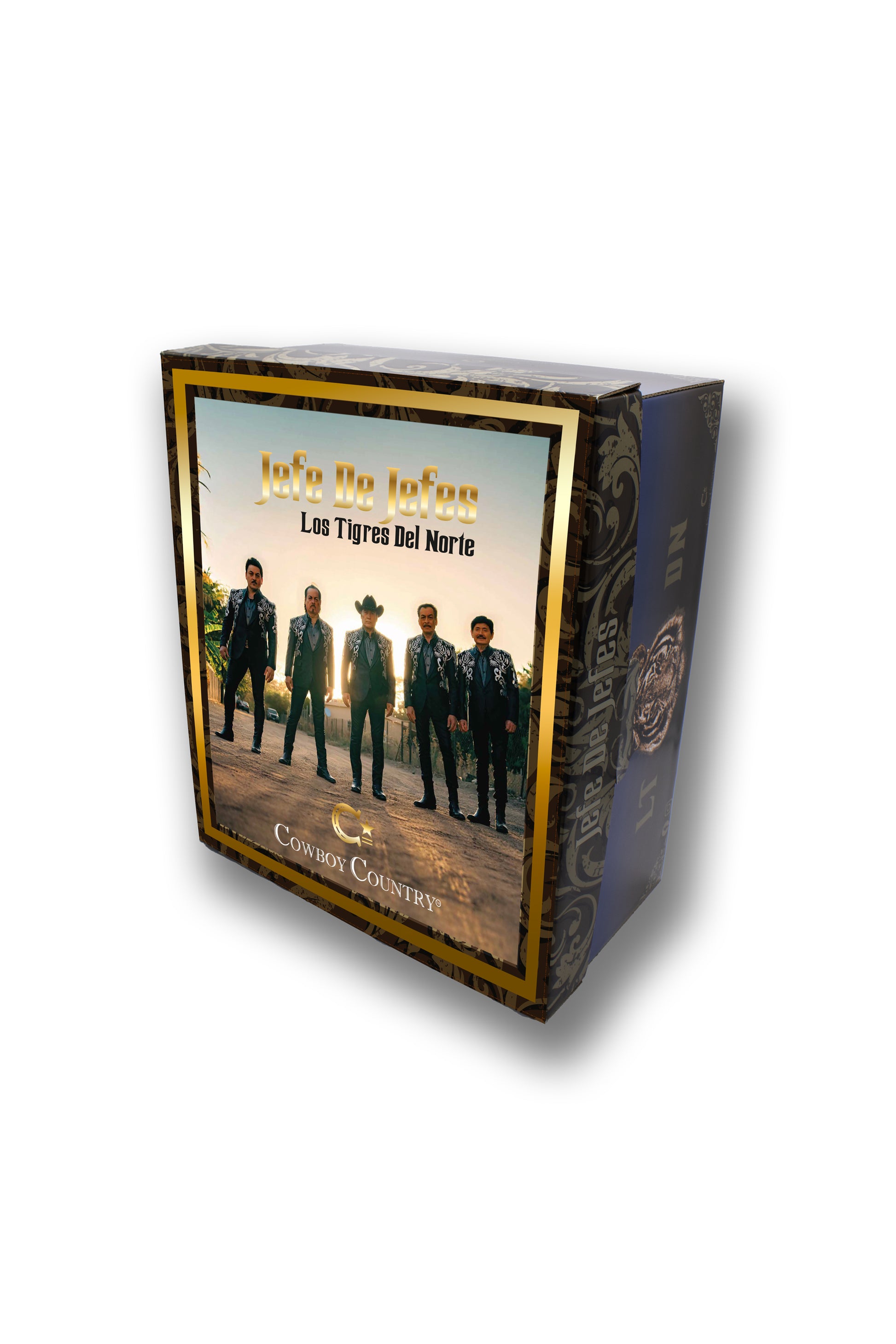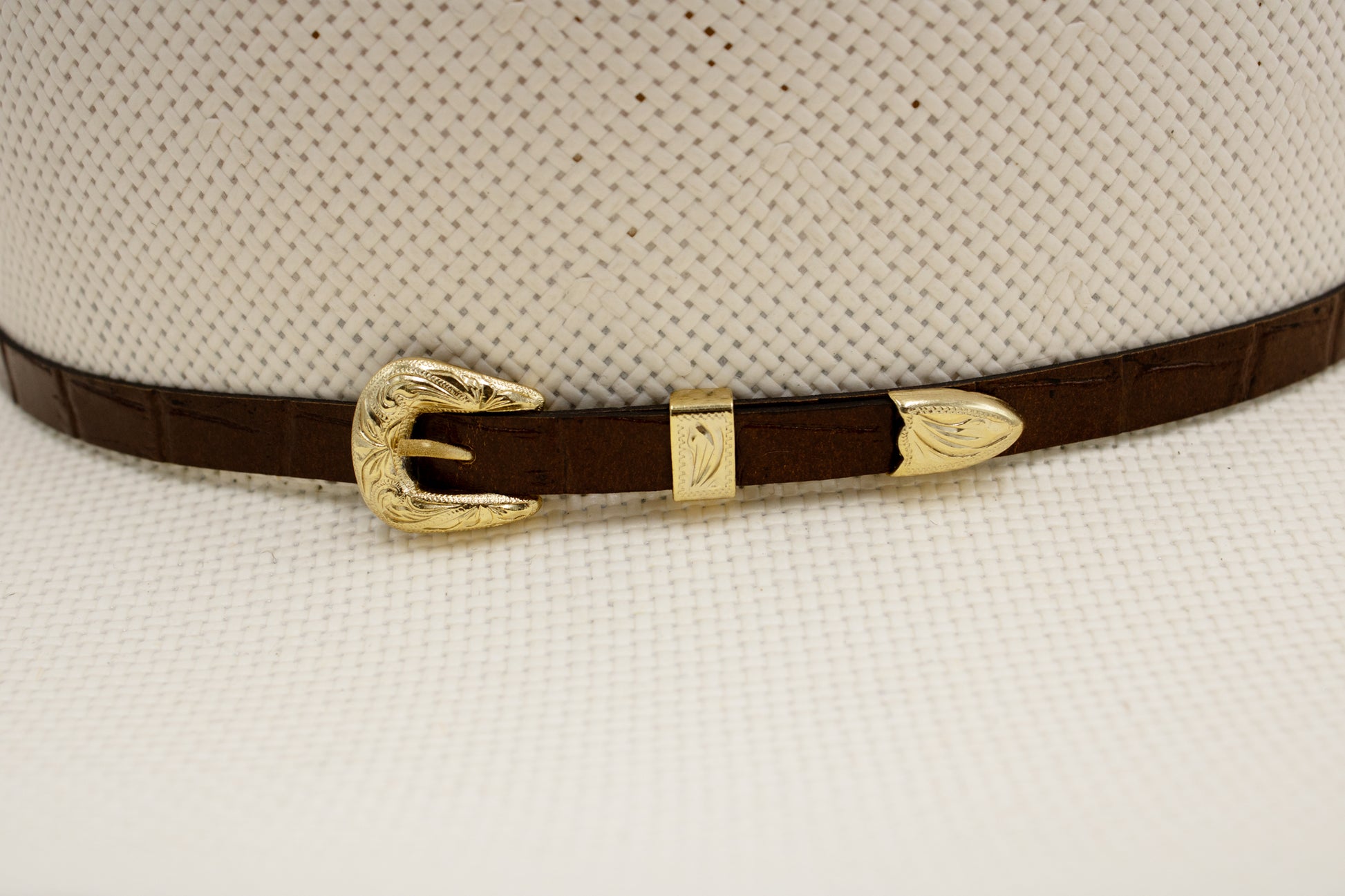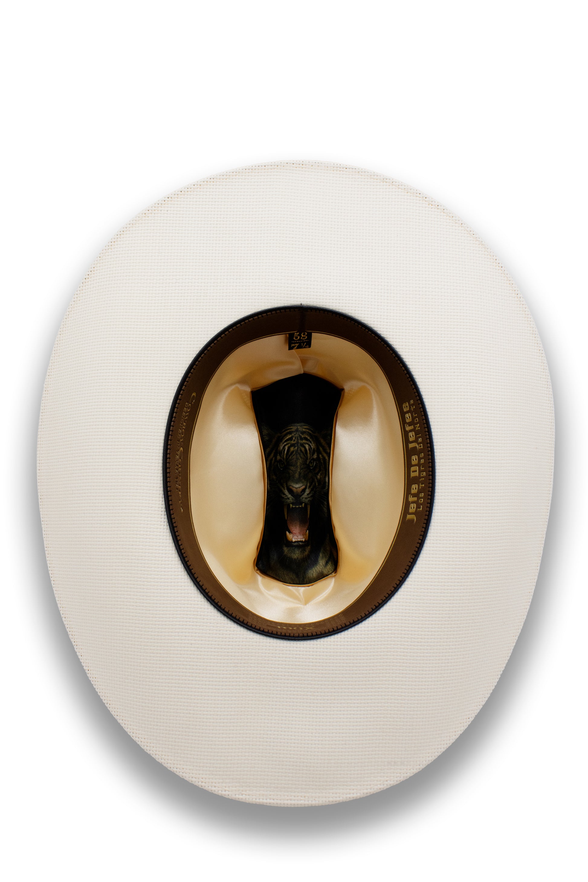 Woven from premium Shantung straw, this hat provides comfort and durability while maintaining a strong rancher profile. The crocodile-style hat band and gold buckle details add a refined western finish, while the sublimated lining gives a subtle nod to the Los Tigres del Norte collection.