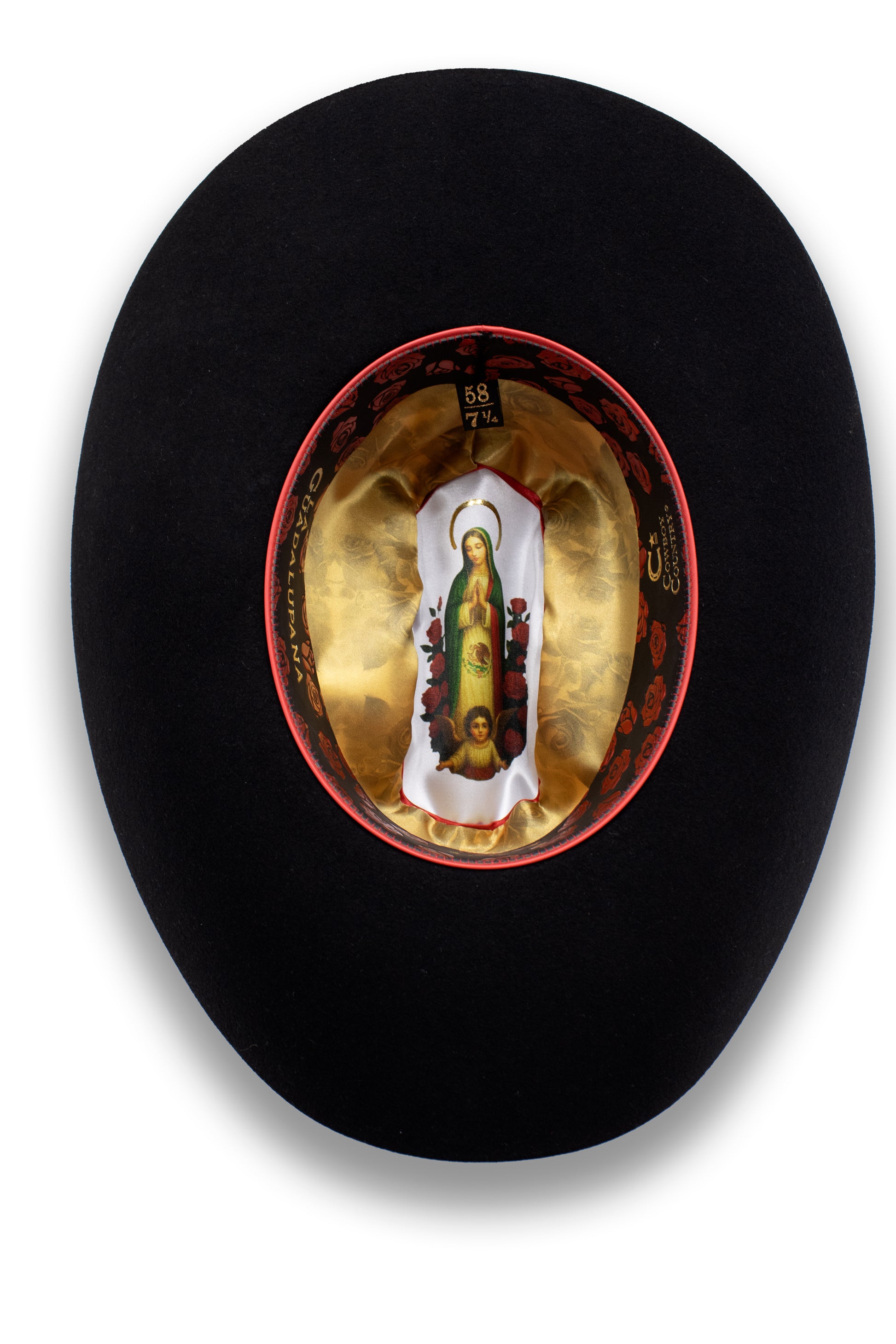 Crafted from premium merino wool, this rancher style hat offers durability, structure, and timeless western character. The buckle set featuring the Virgen de Guadalupe adds meaningful detail, while the interior lining reflects the same spiritual inspiration.