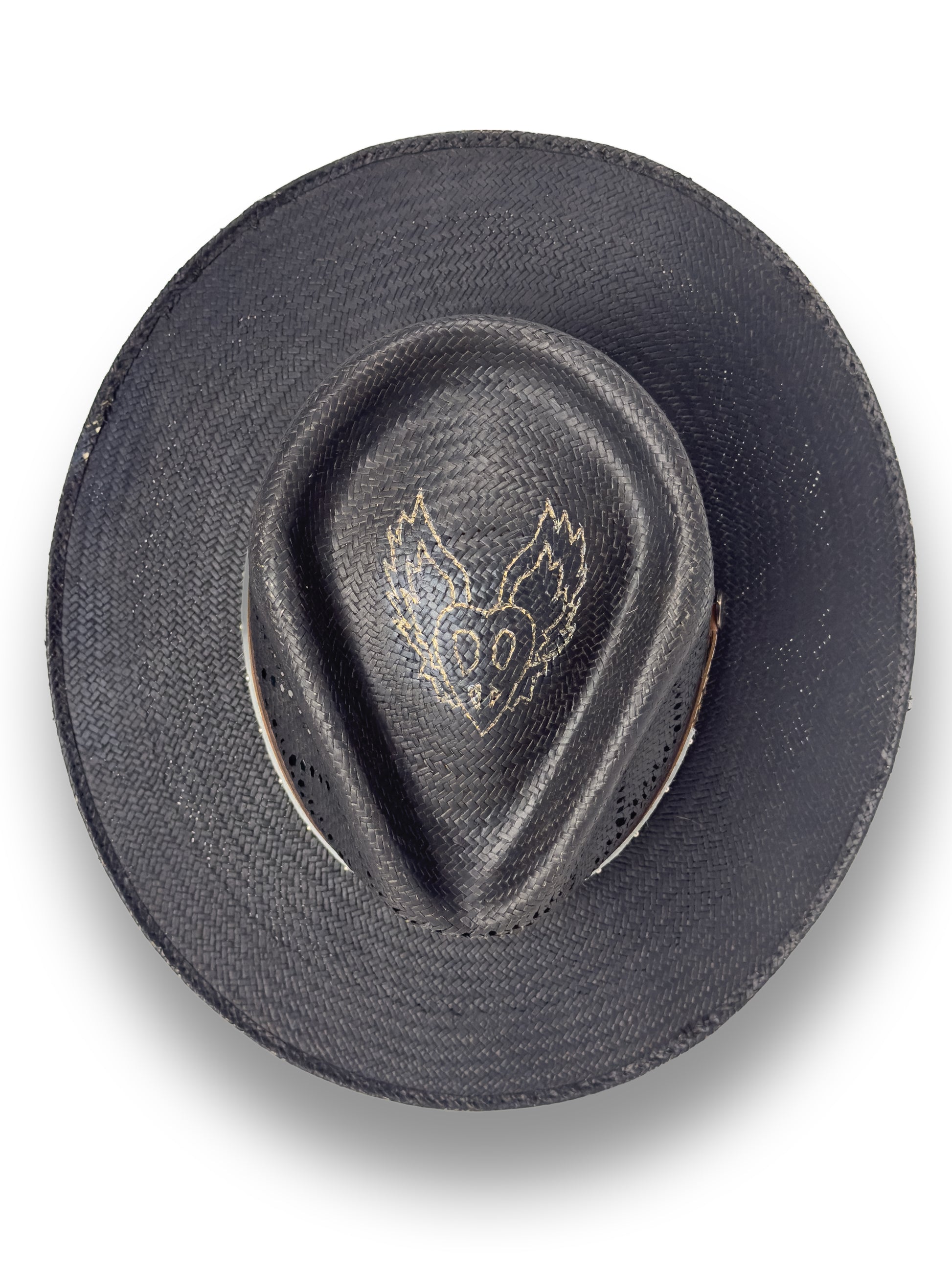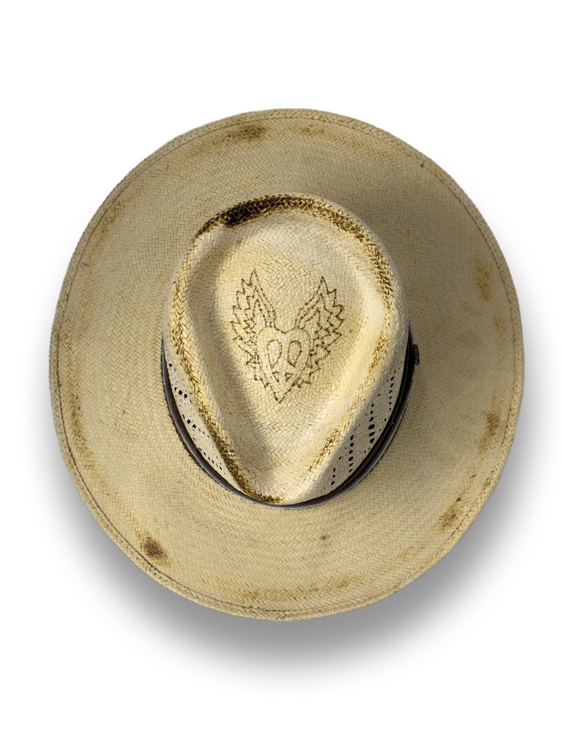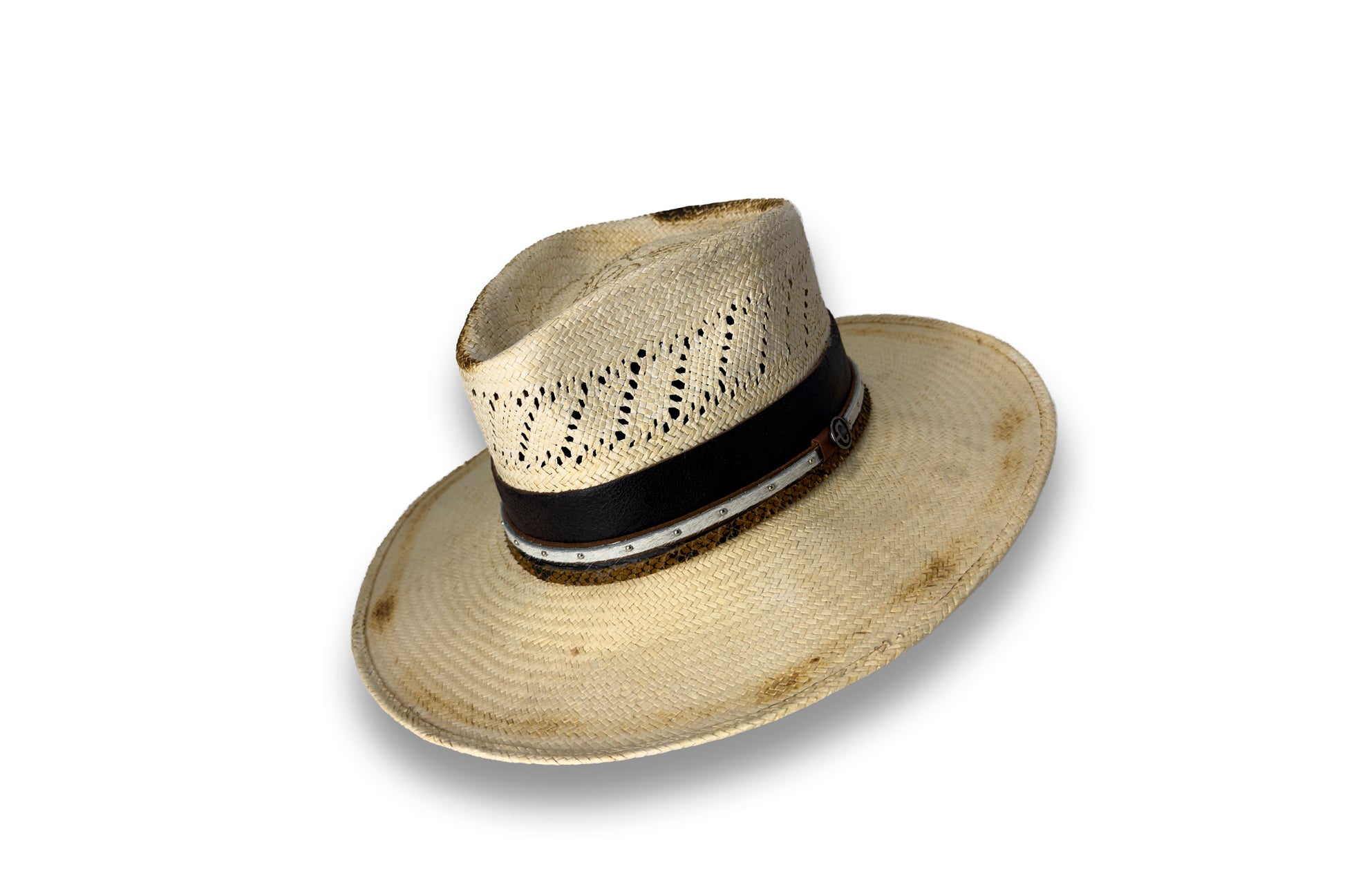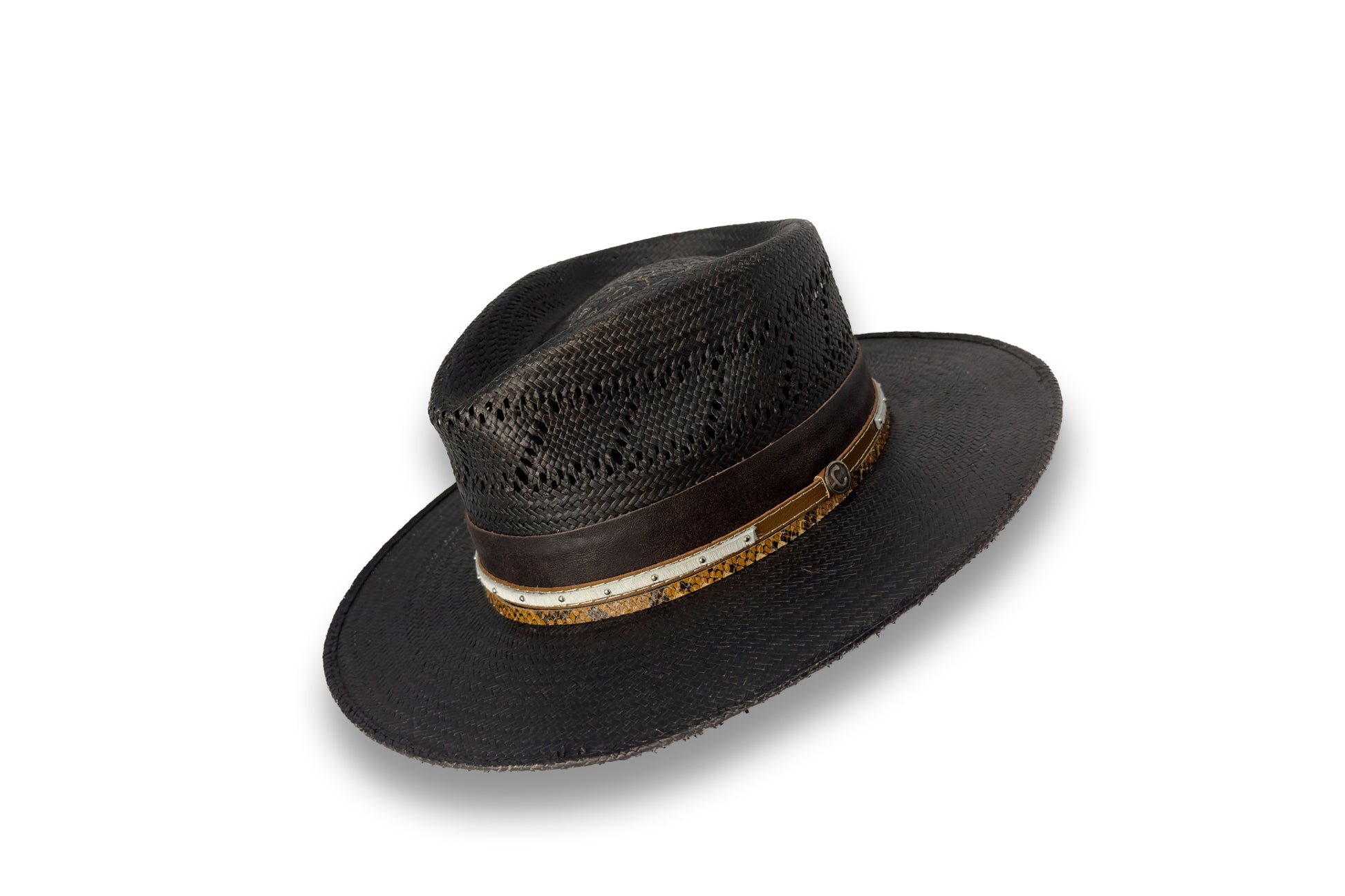 Made from handwoven vented Toyo straw, it features a distressed finish with burned designs and unique messaging. The leather band with snake and hair-on-calf overlay completes the rugged look.