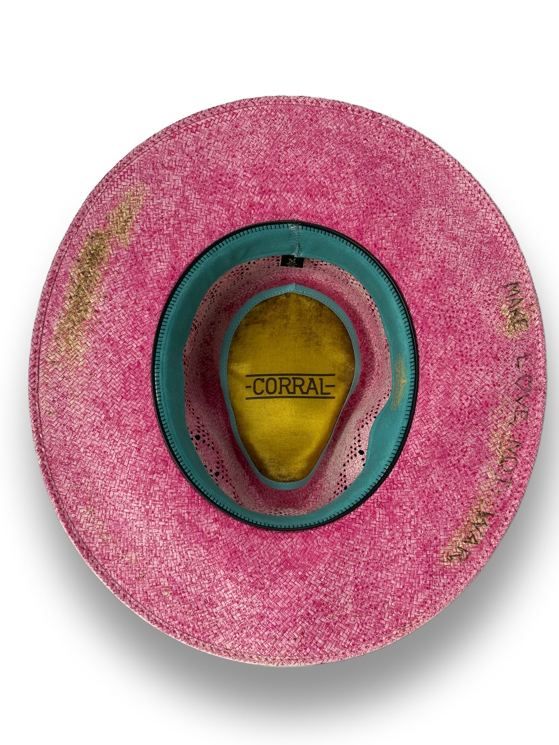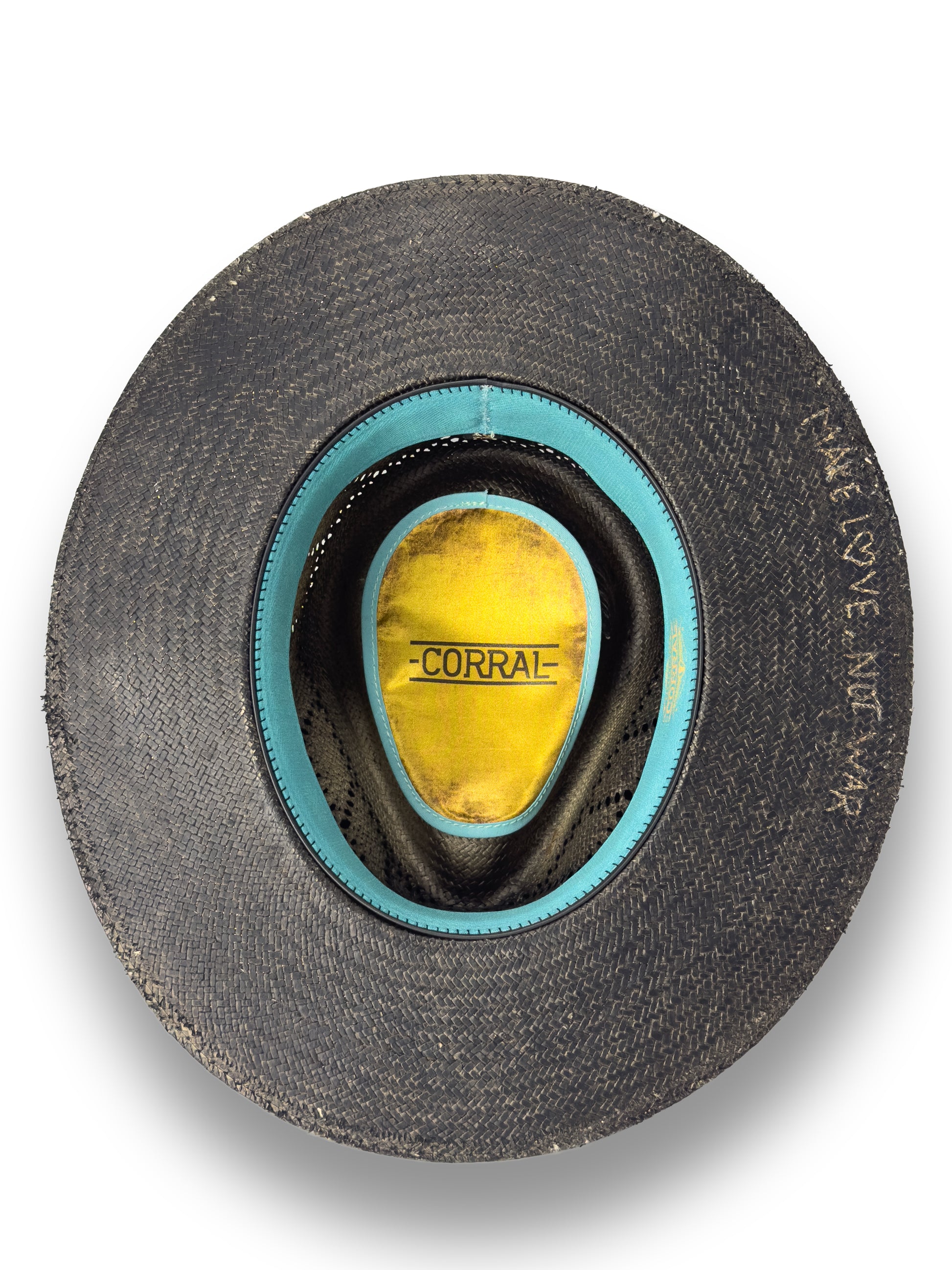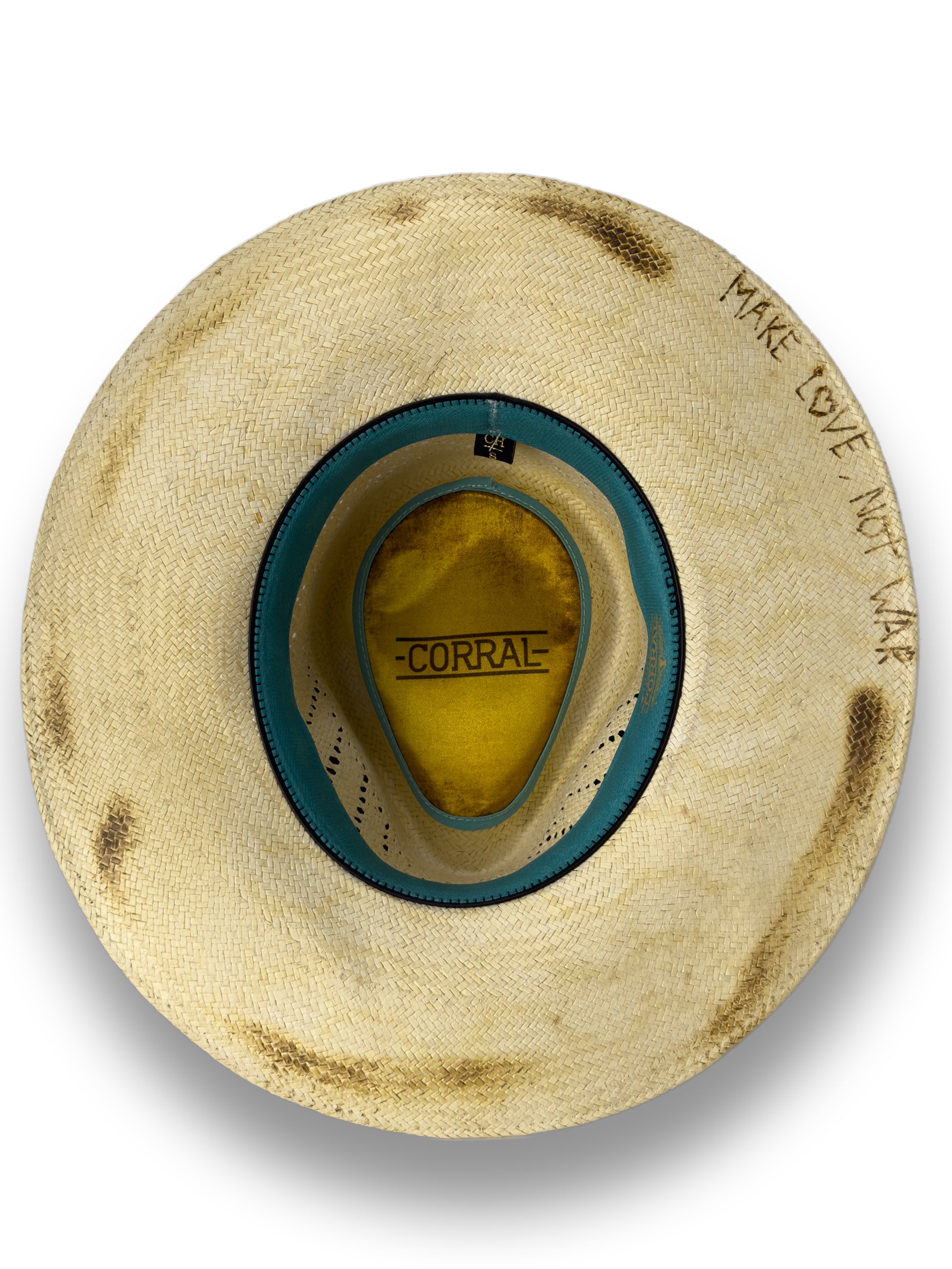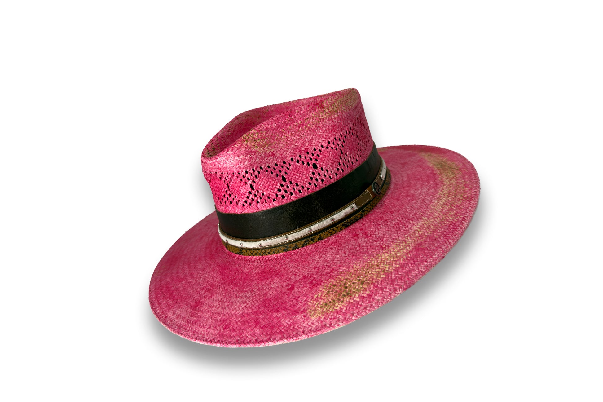 Made from handwoven vented Toyo straw, it features a distressed finish with burned designs and unique messaging. The leather band with snake and hair-on-calf overlay completes the rugged look.